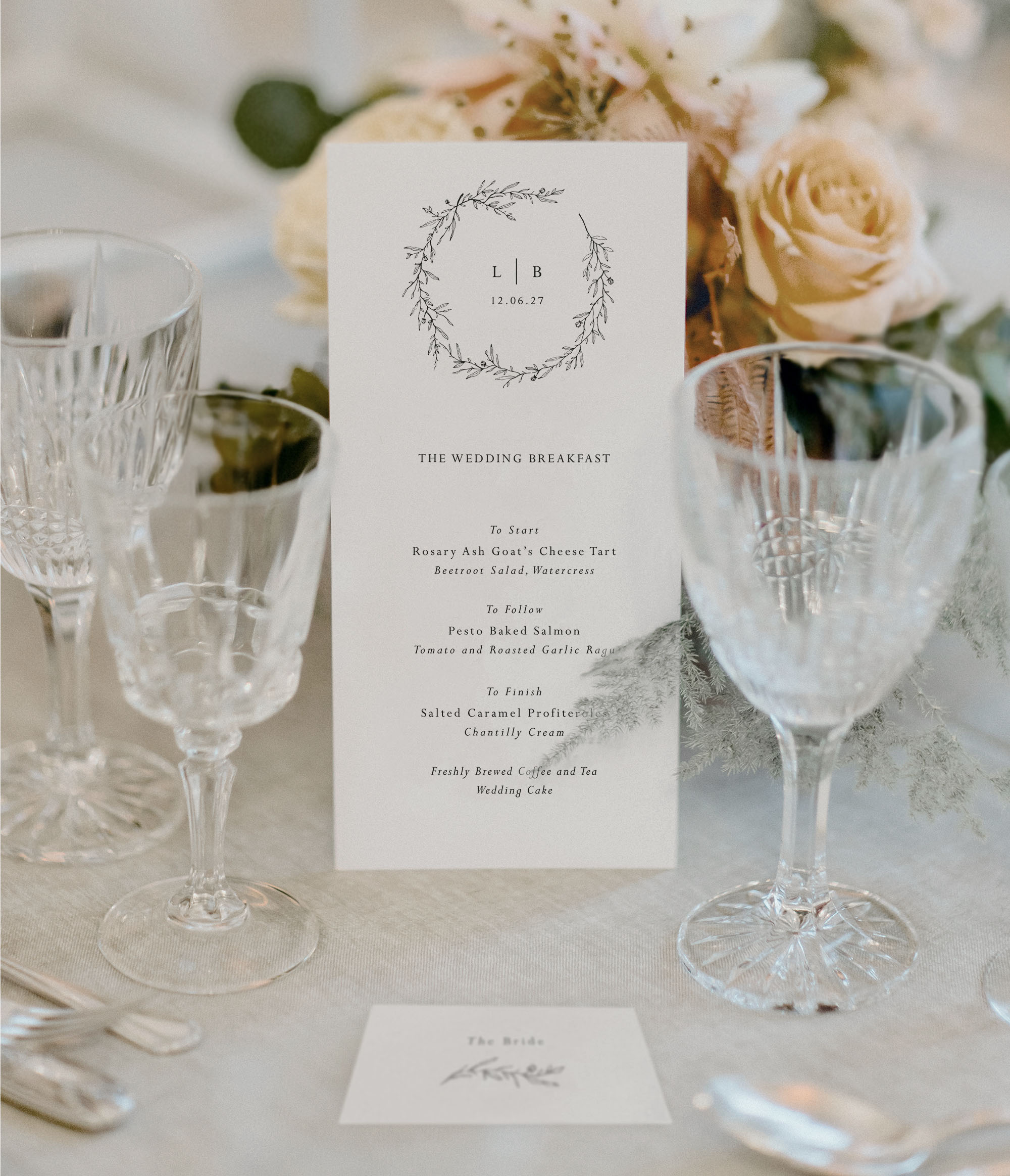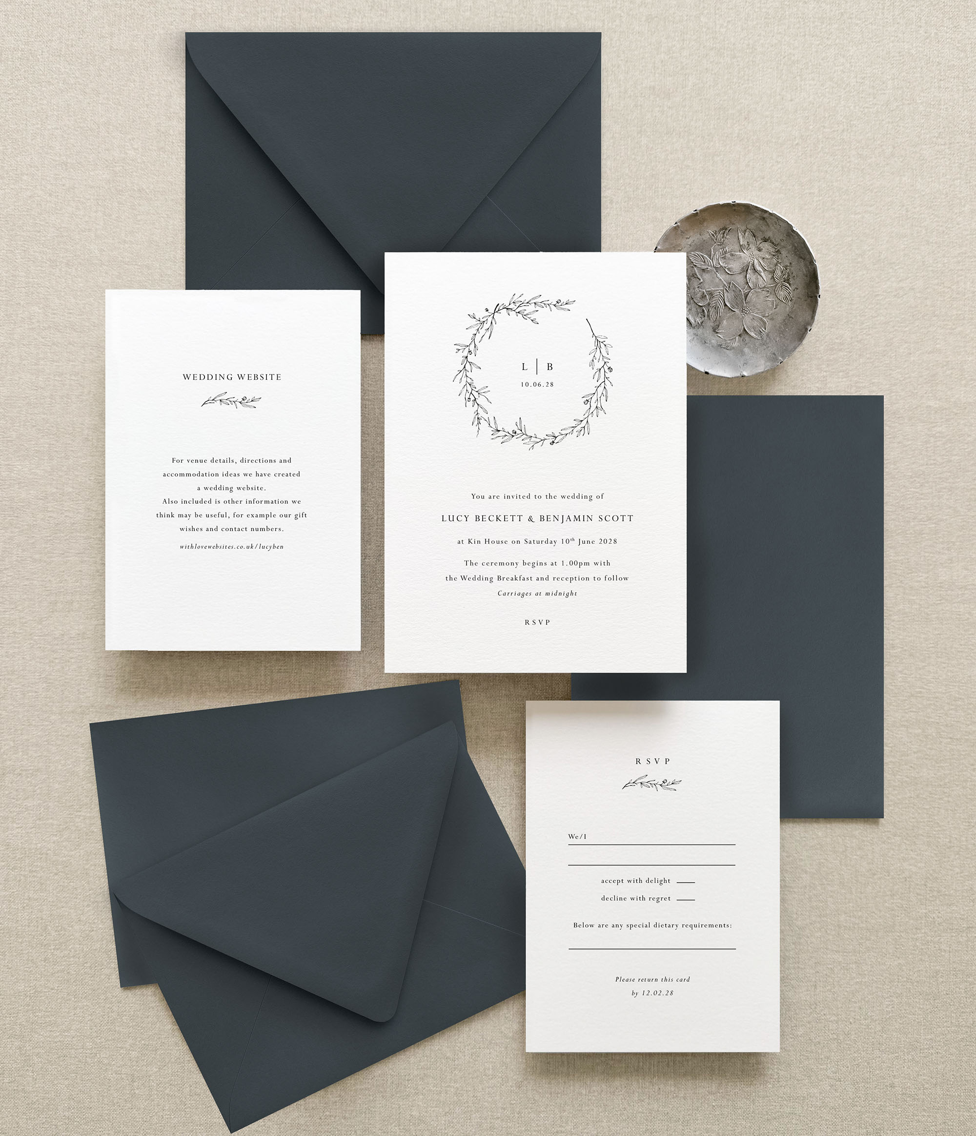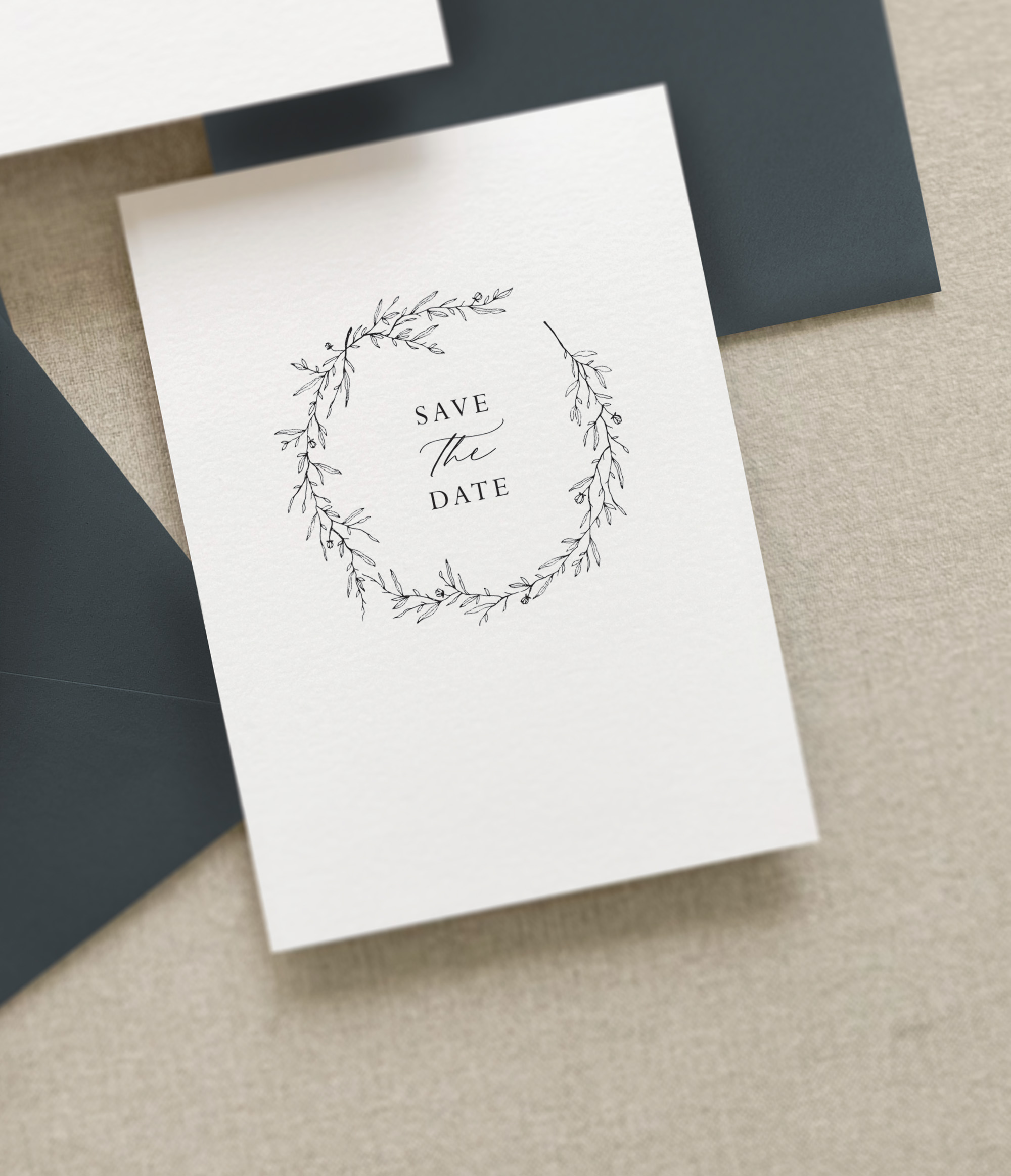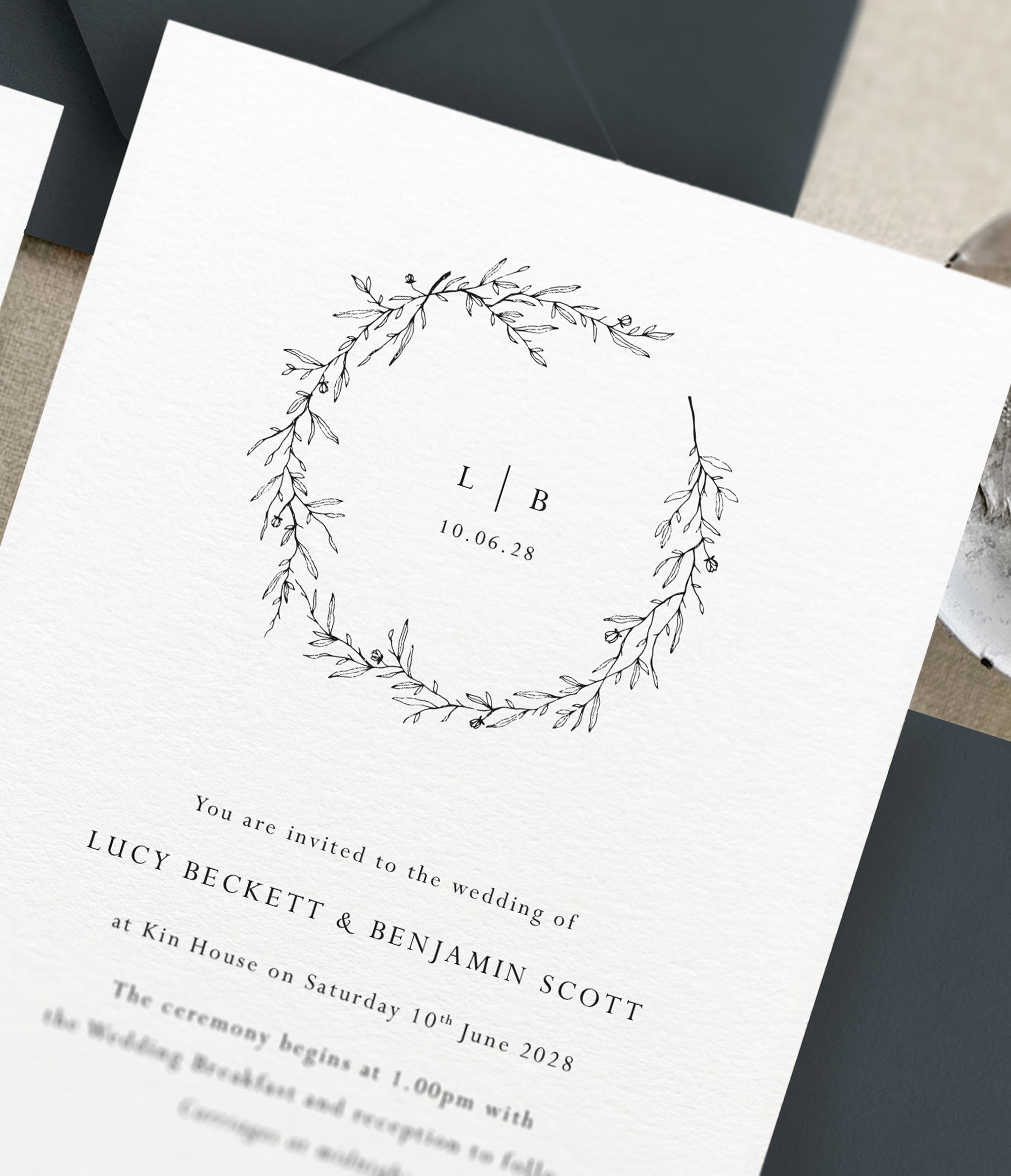 Printed in crisp black ink on our signature eggshell white card, the design feels timeless and versatile, working beautifully with any colour palette. The subtle texture of the wreath softens the formality, striking a balance between refined and relaxed. Perfect for both classic and modern celebrations, this collection brings a polished yet natural charm to your day.