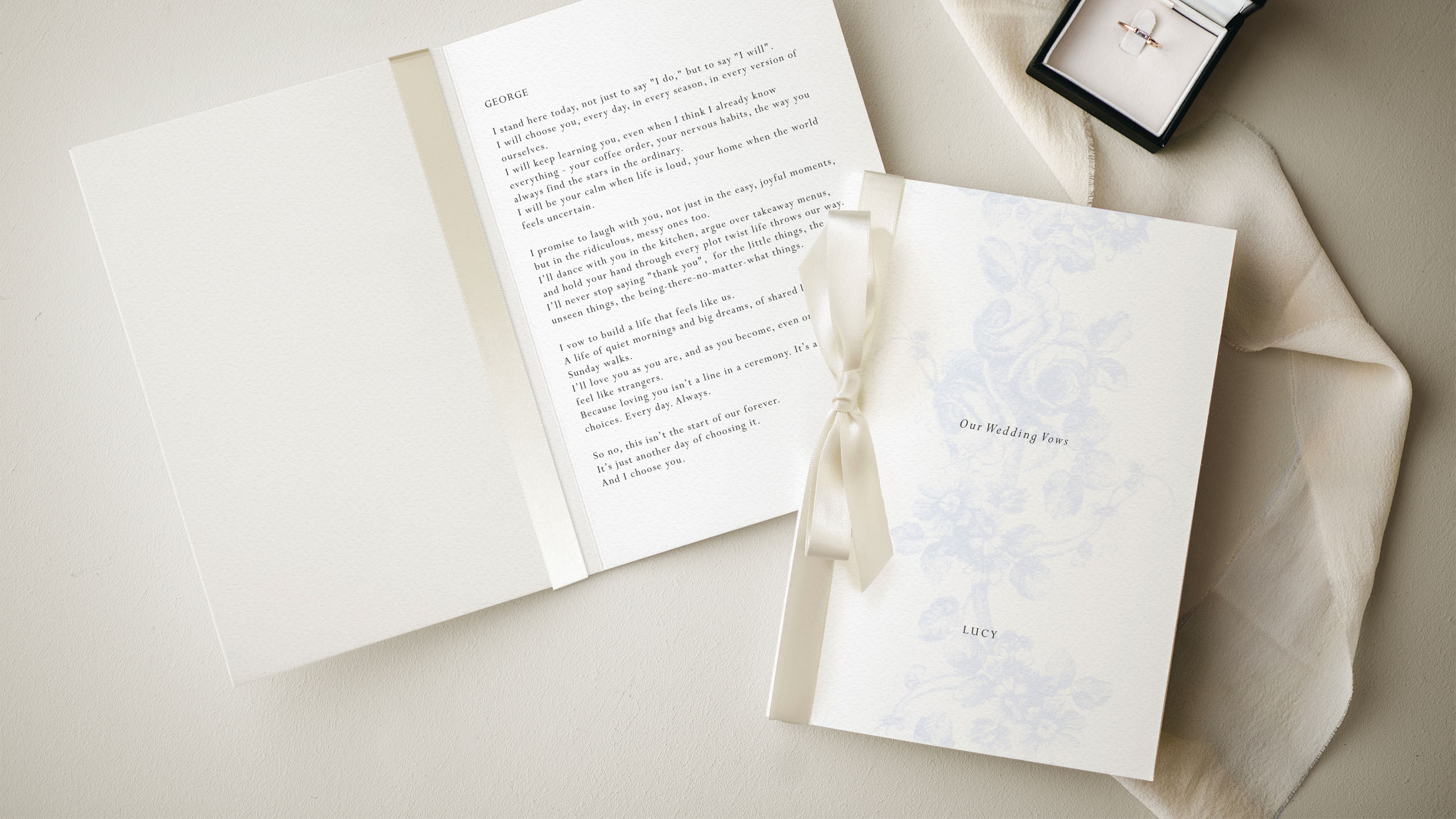 Our wedding vow books were created with this thought in mind. Each one is a softly textured folded card which lies flat when held. The inside is personalised with your cherished words, or left blank for you to handwrite your own vows and promises.