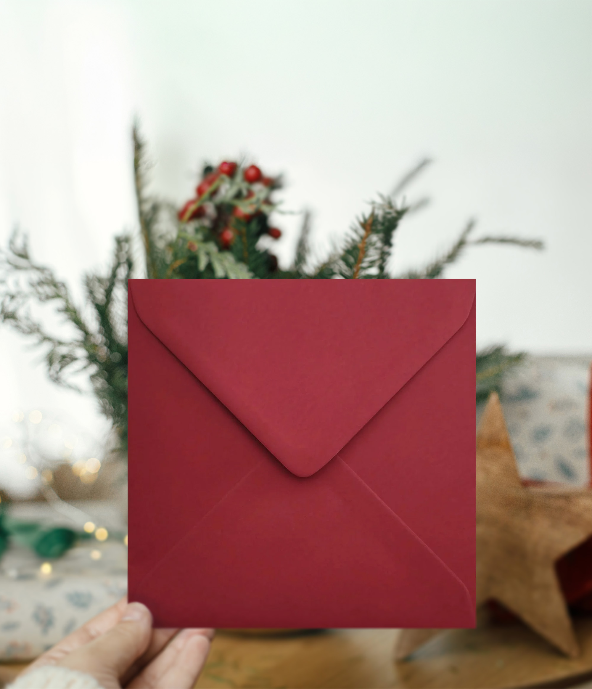 The square (15 x 15cm) folded card comes to you with a quality Christmas red envelope.