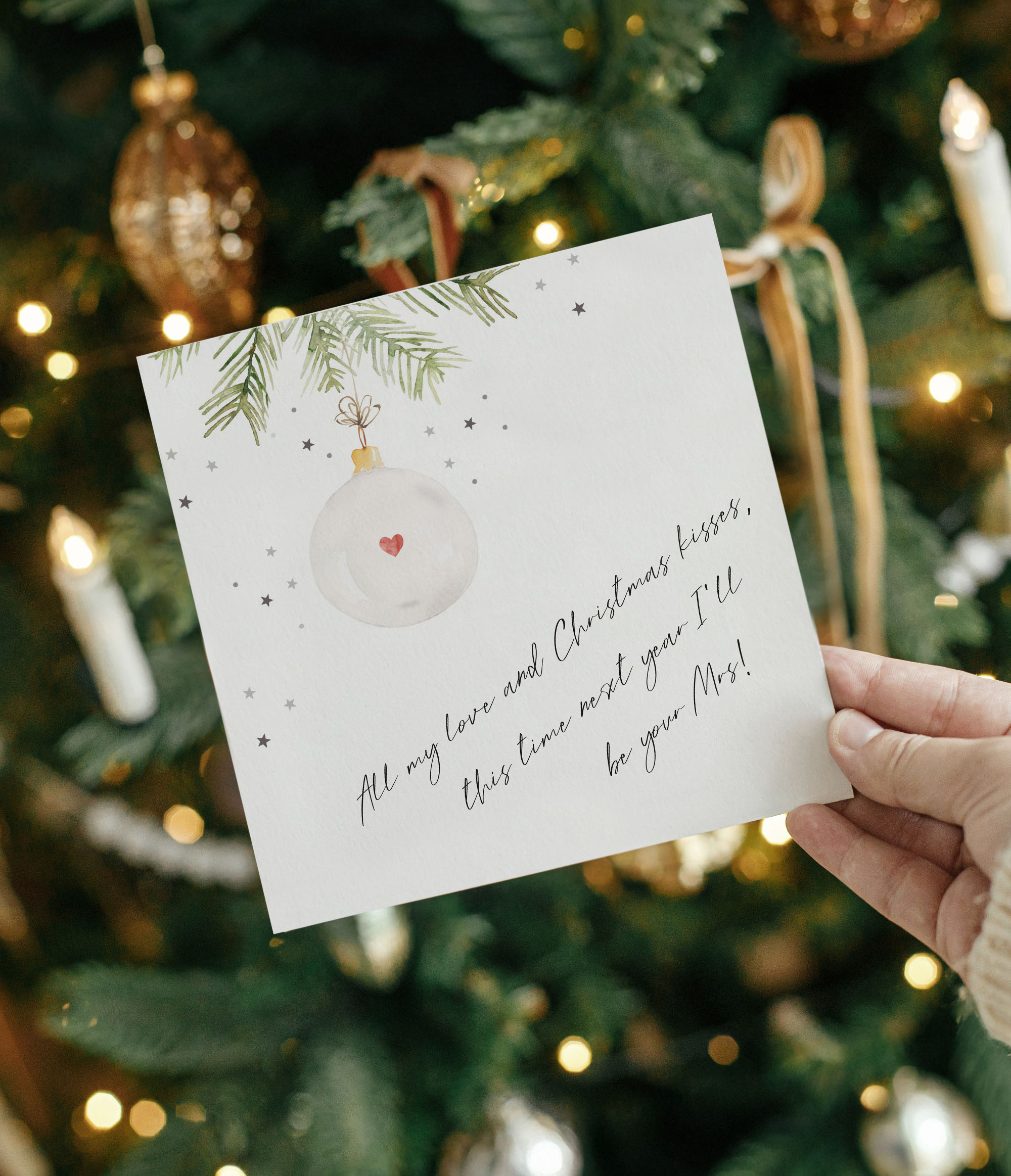 The words ‘All my love and Christmas Kisses, this time next year I’ll be your Mrs!’ are printed on the front, and it is illustrated with a simple white bauble. A small red heart floats in the decoration, it’s a subtle way of saying I love you to your husband to be. Imagine the look on their face when they open and read the words, it will show you have really thought about this milestone moment!