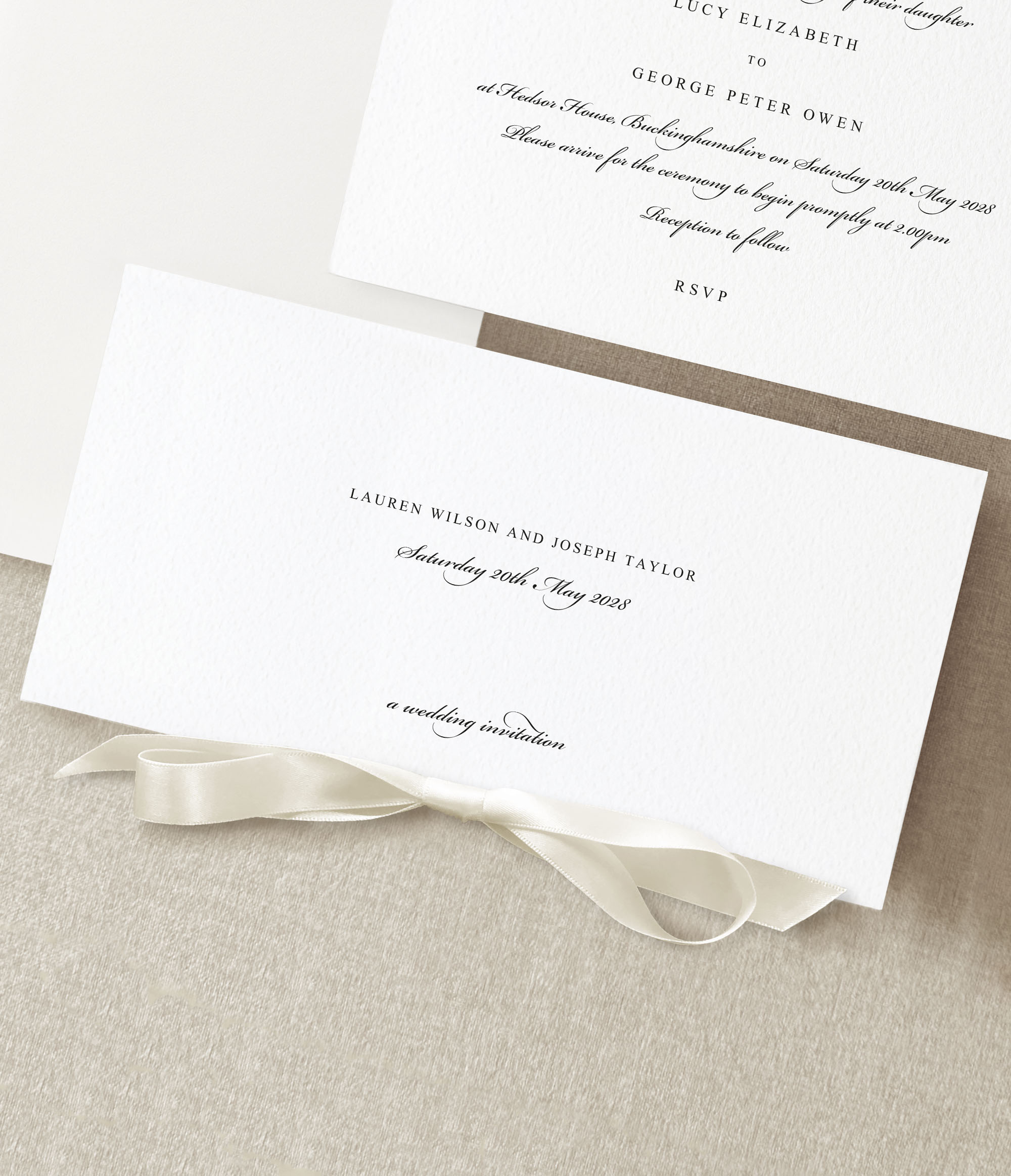The folded wedding invitation is finished with a satin ribbon, adding a tactile layer of luxury to the design. Printed in crisp black ink on soft ivory textured card, the suite balances simplicity with elegance. With ribbon shades chosen to complement your colour scheme, this collection creates a cohesive, polished look for your day.
