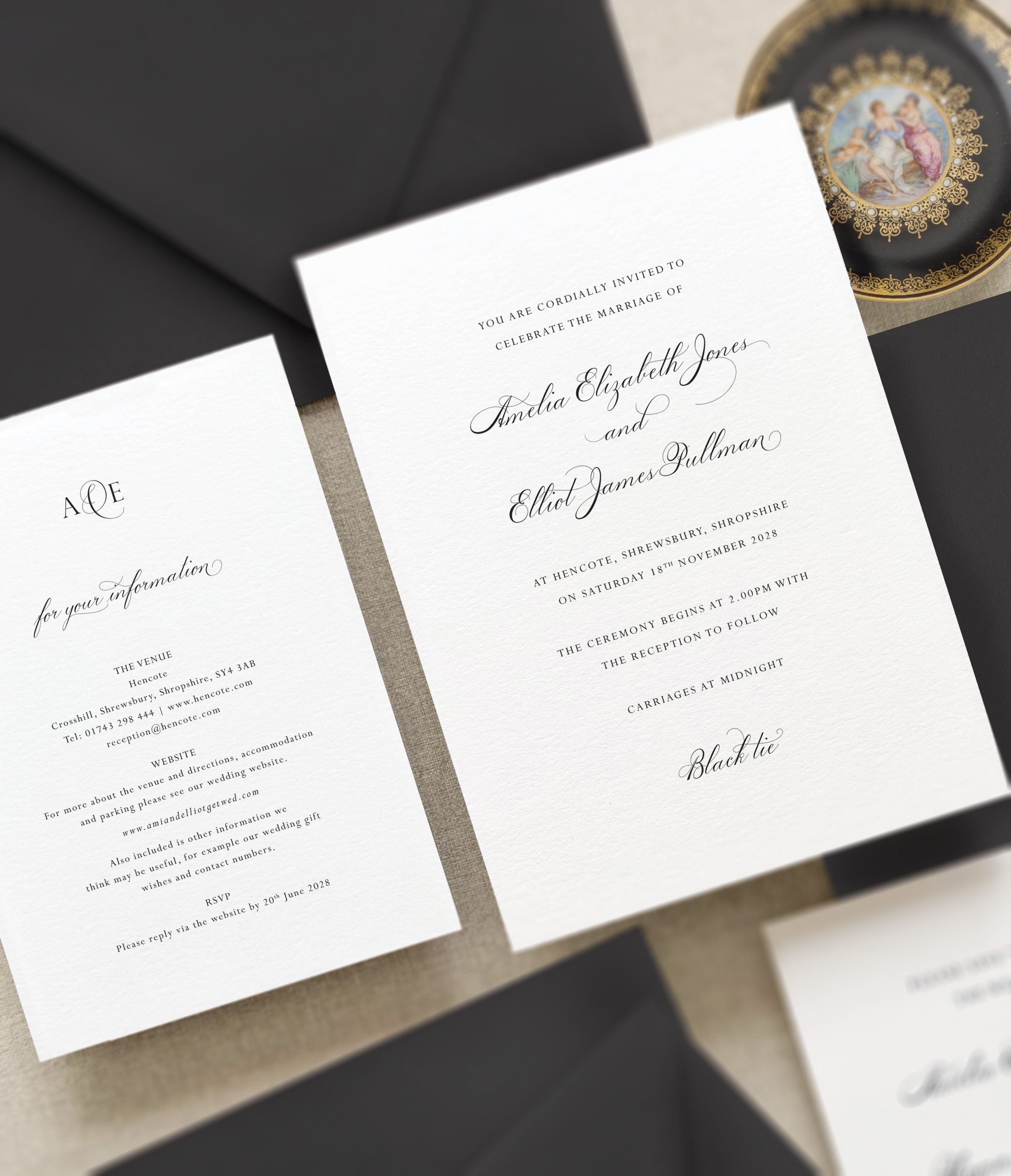With the exquisite swirls and curls of the font, your names are the centre of attention. As with most of our timeless collections, the stationery is a blank canvas; allowing you to pair it with any colour palette, it works so well for a black and white wedding theme.