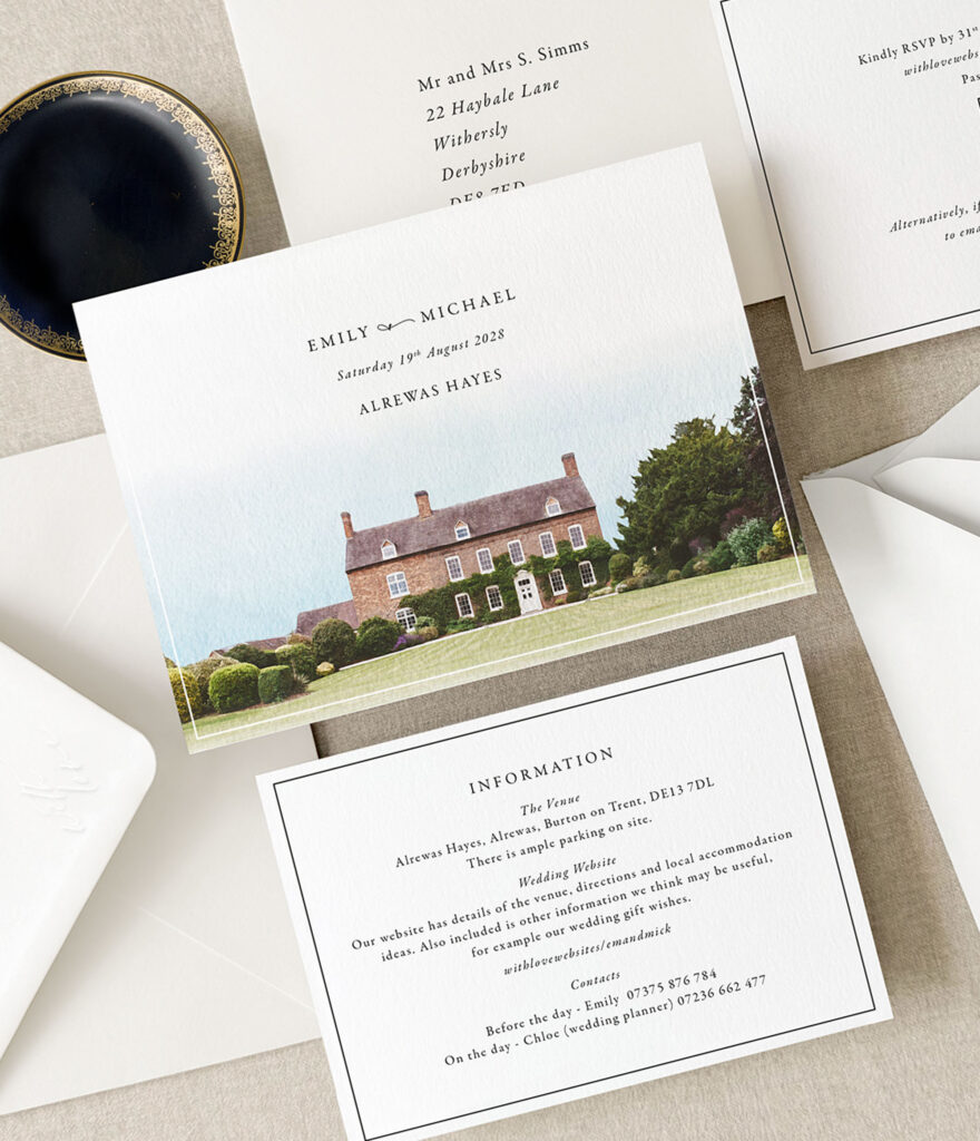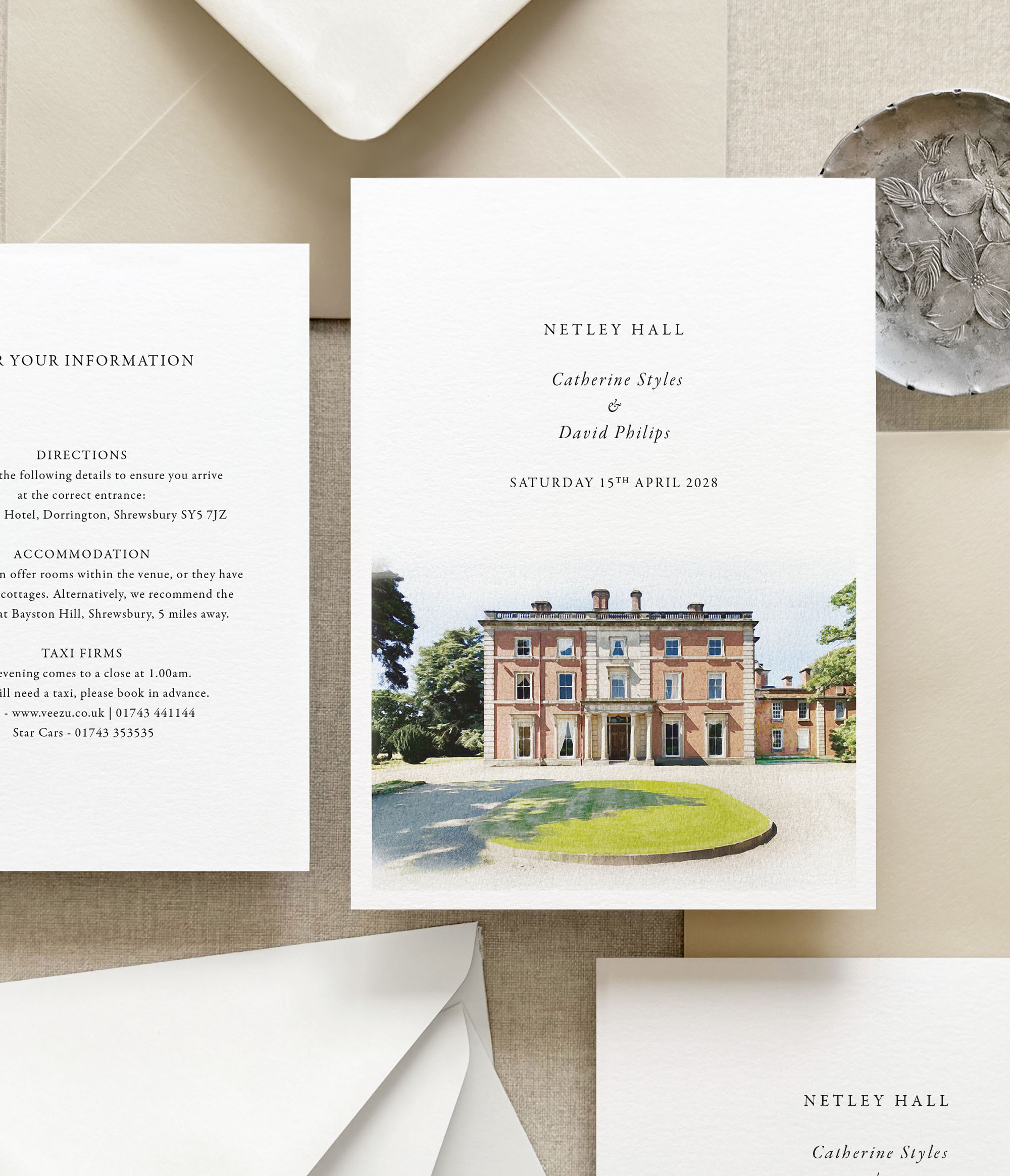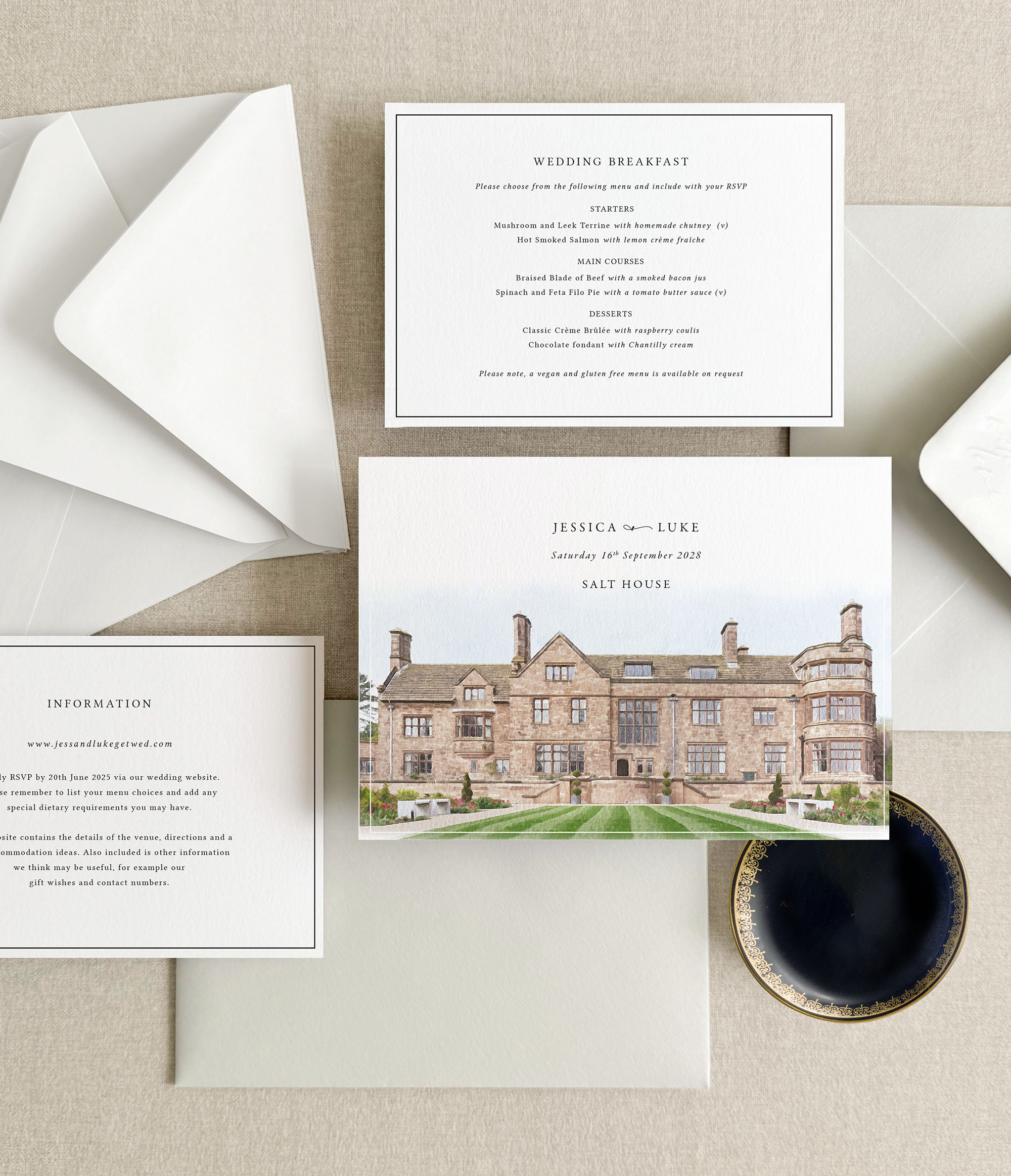 Our illustrated venue collection is personalised wedding stationery using a beautiful, digitally created watercolour style illustration of your venue.
