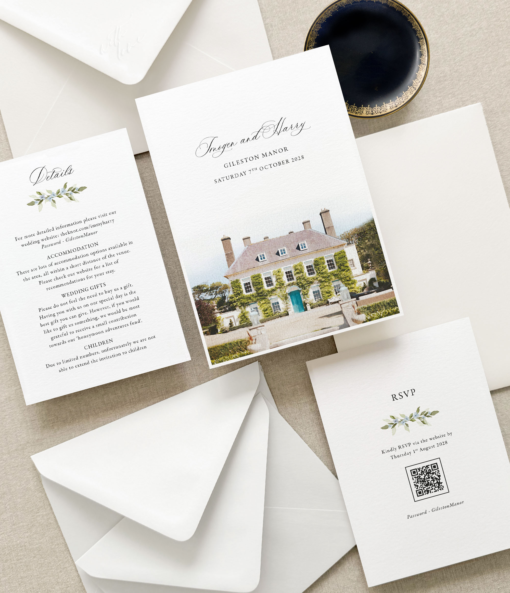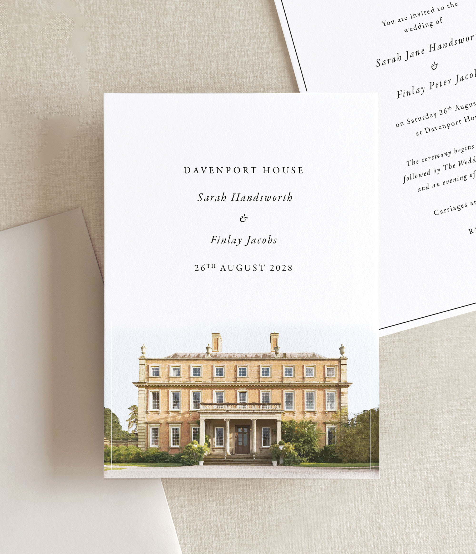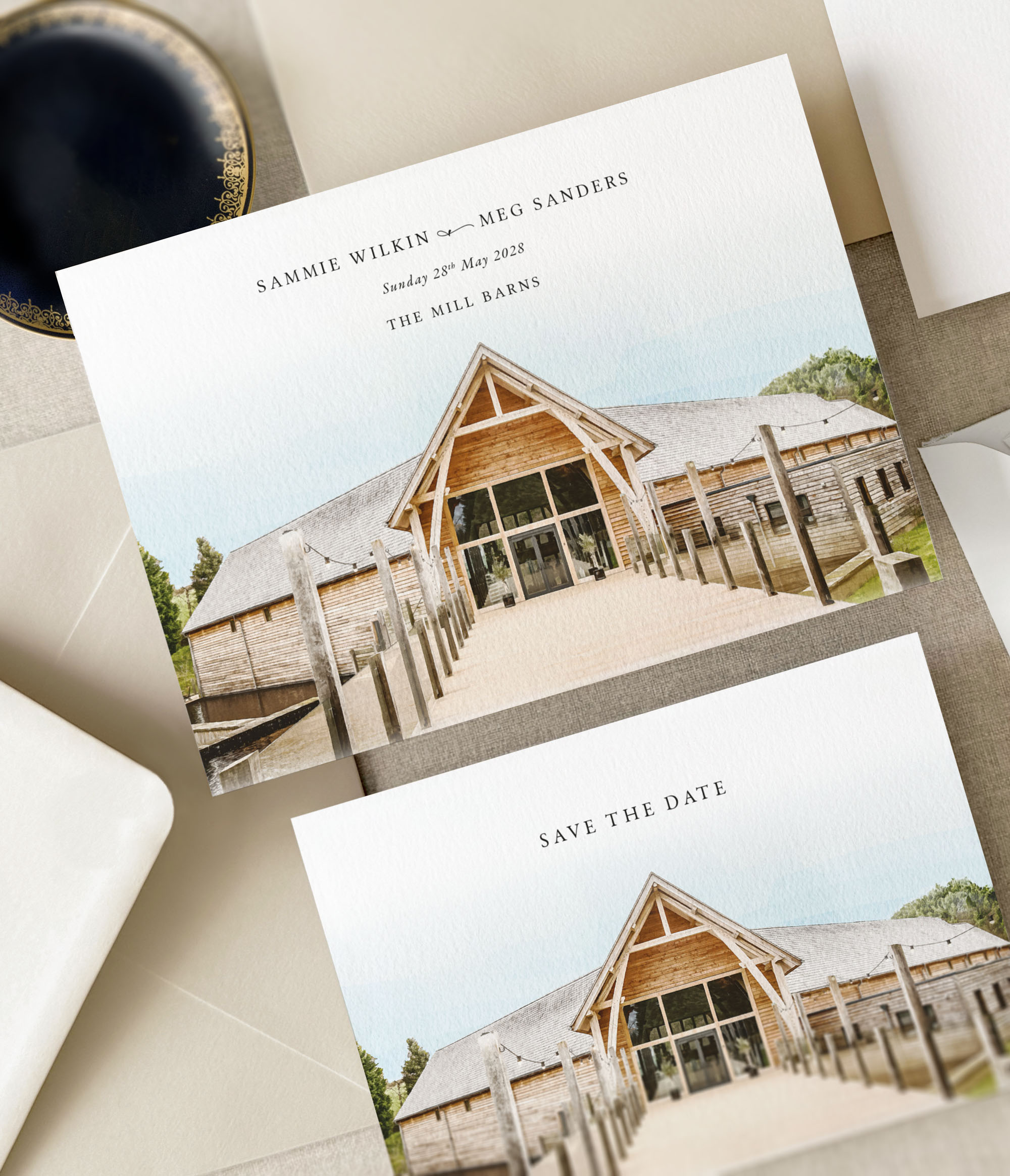 Our illustrated venue collection is personalised wedding stationery using a beautiful, digitally created watercolour style illustration of your venue.