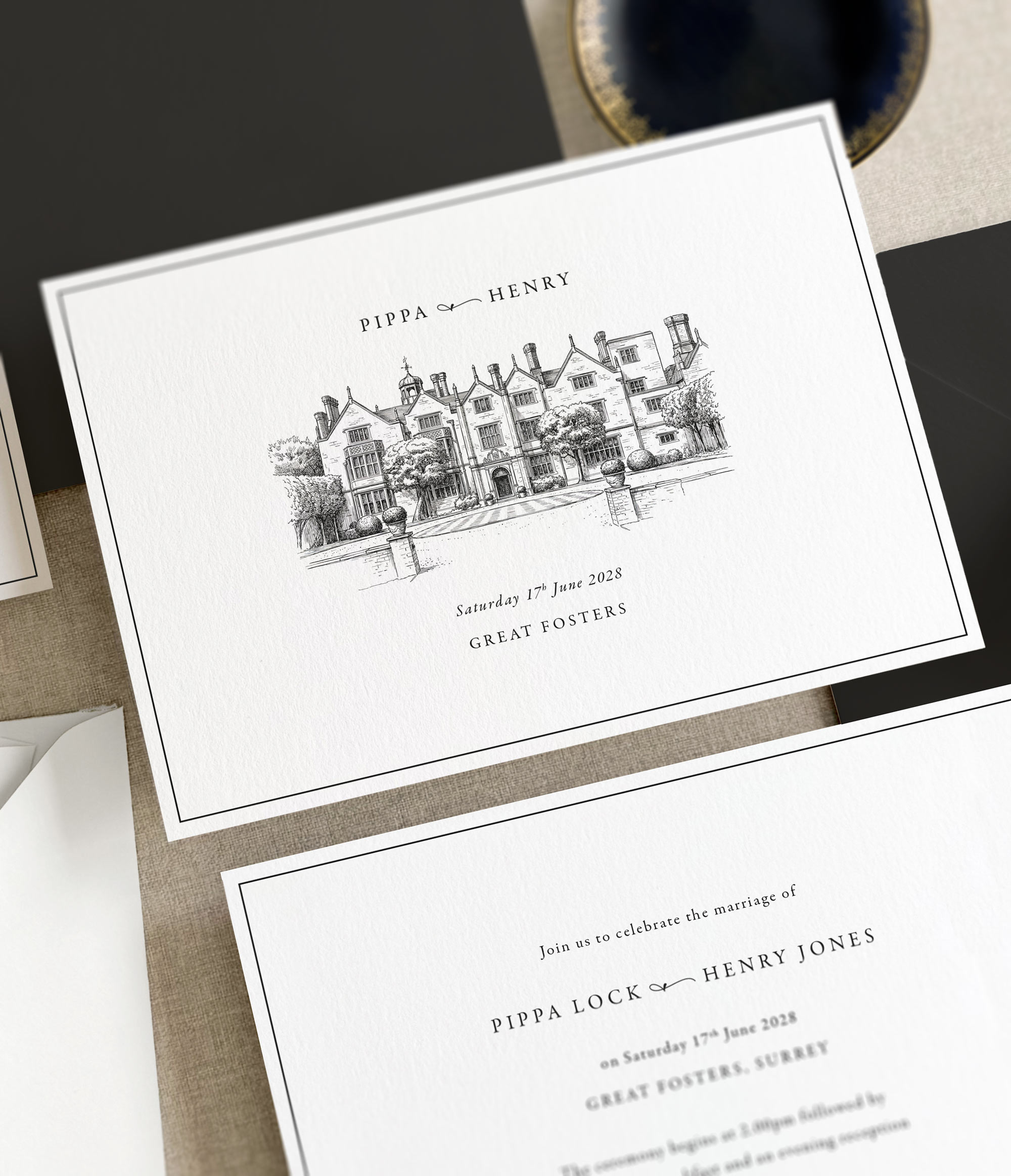 Using a simple black and white digital ink drawing of your wedding venue as the focal point of your stationery is a subtle yet striking way to wow your guests.