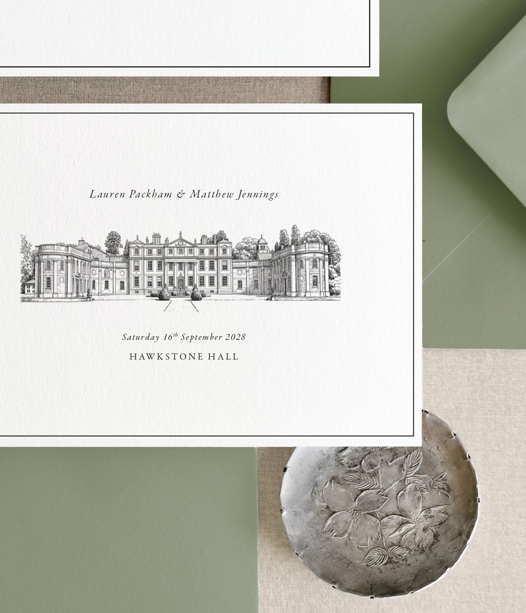 We can create a range of wedding stationery in the sketched venue collection. *Not all of the pieces will have the venue on them. For the other pieces of stationery, we will use your font choice to keep the continuity.