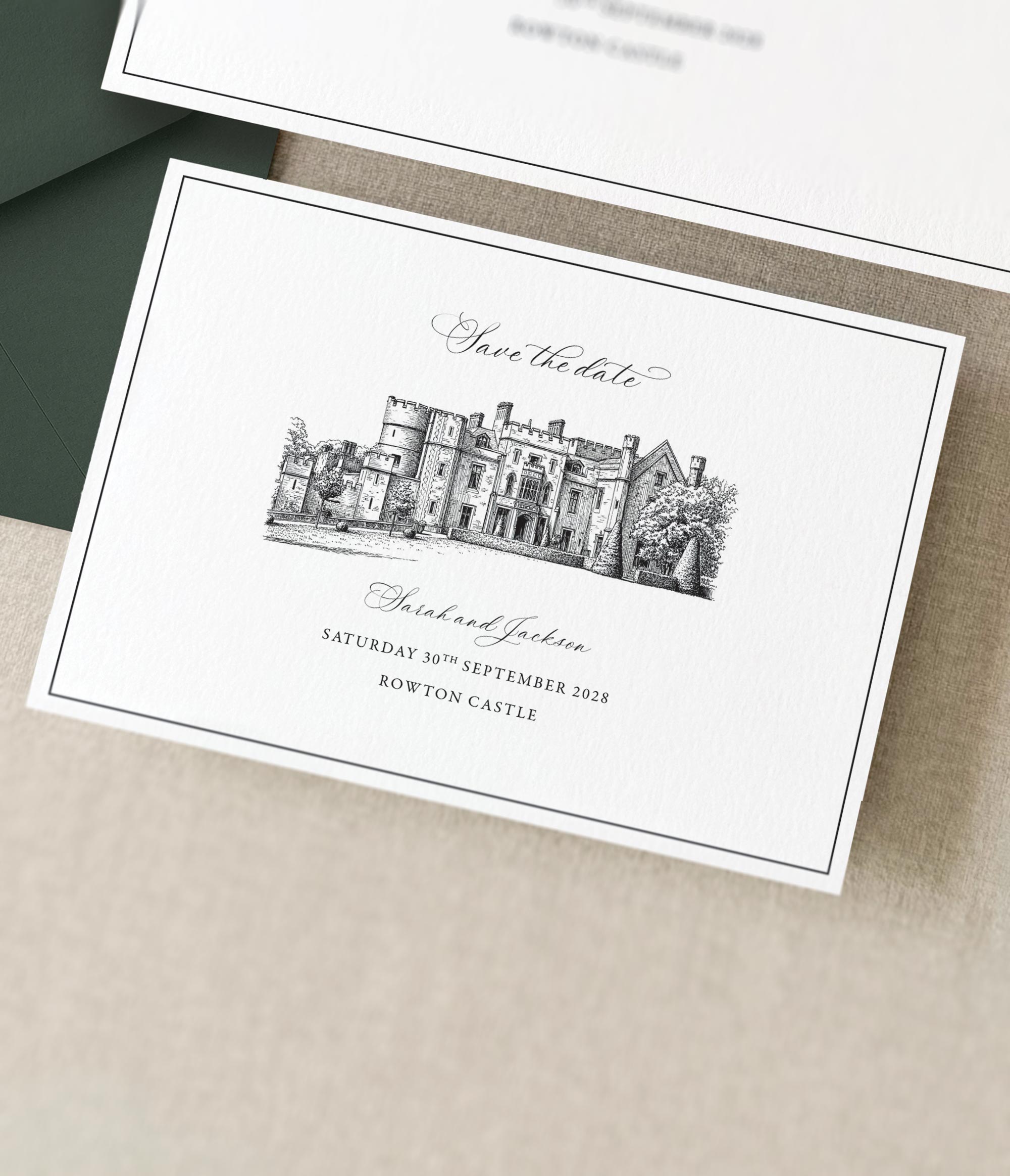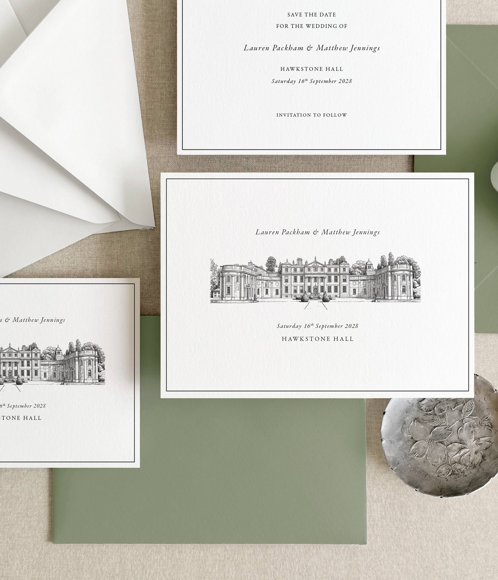 If your venue is already part of the collection, there’s no additional design fee. For new venues, a small £25 fee applies to cover the time and care that goes into creating your bespoke line drawing of your wedding venue. Your stationery is then priced per piece as usual.