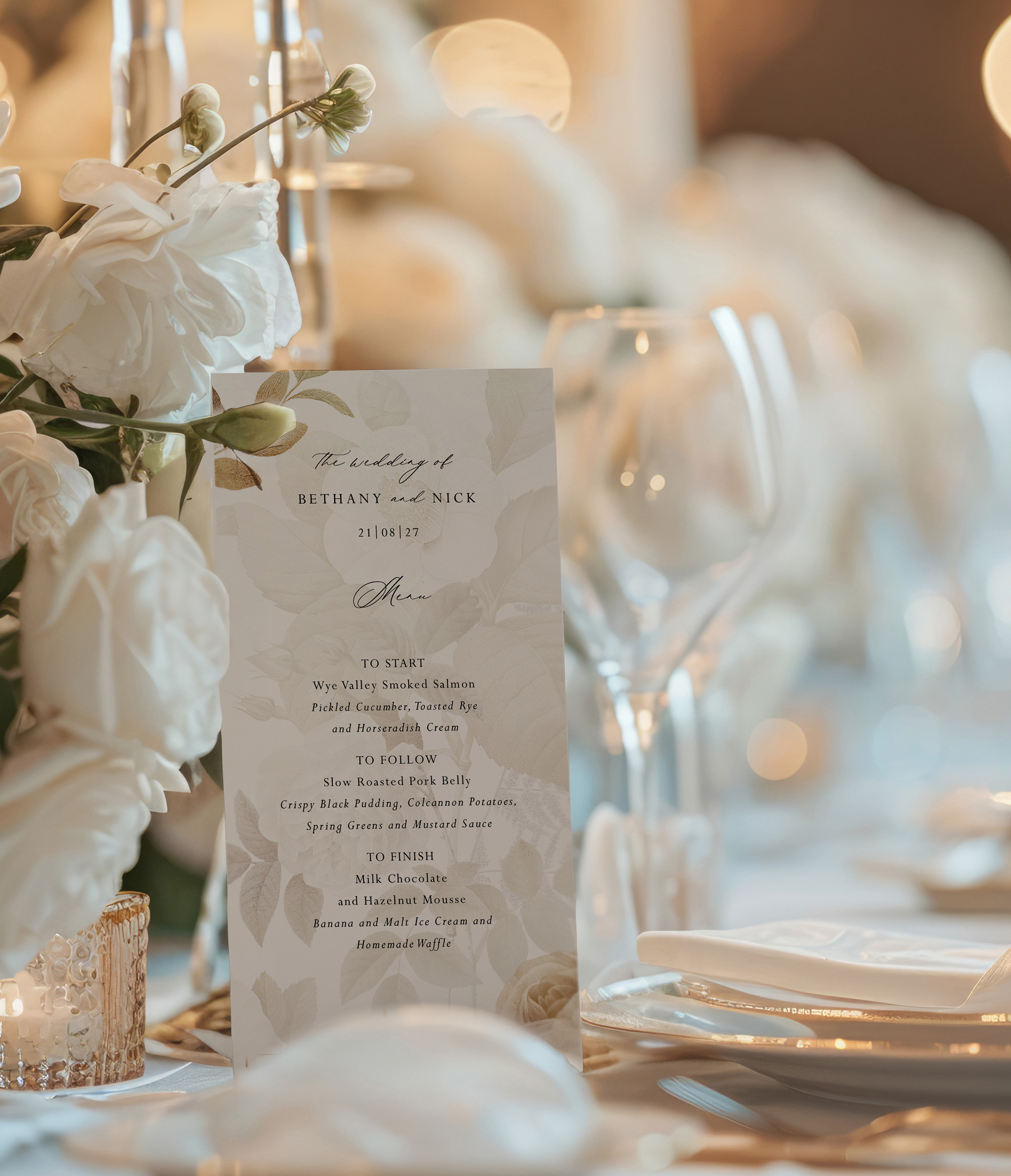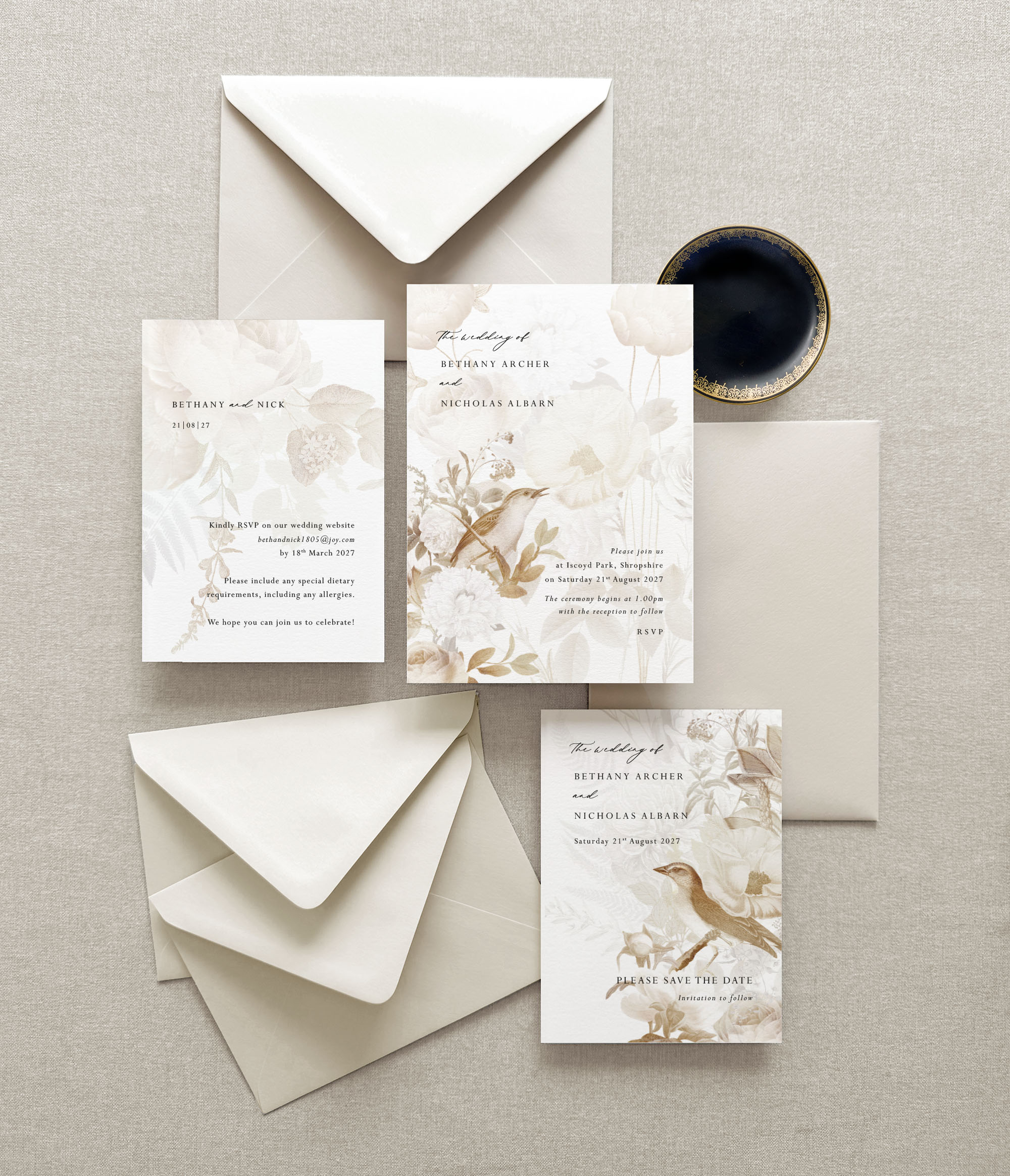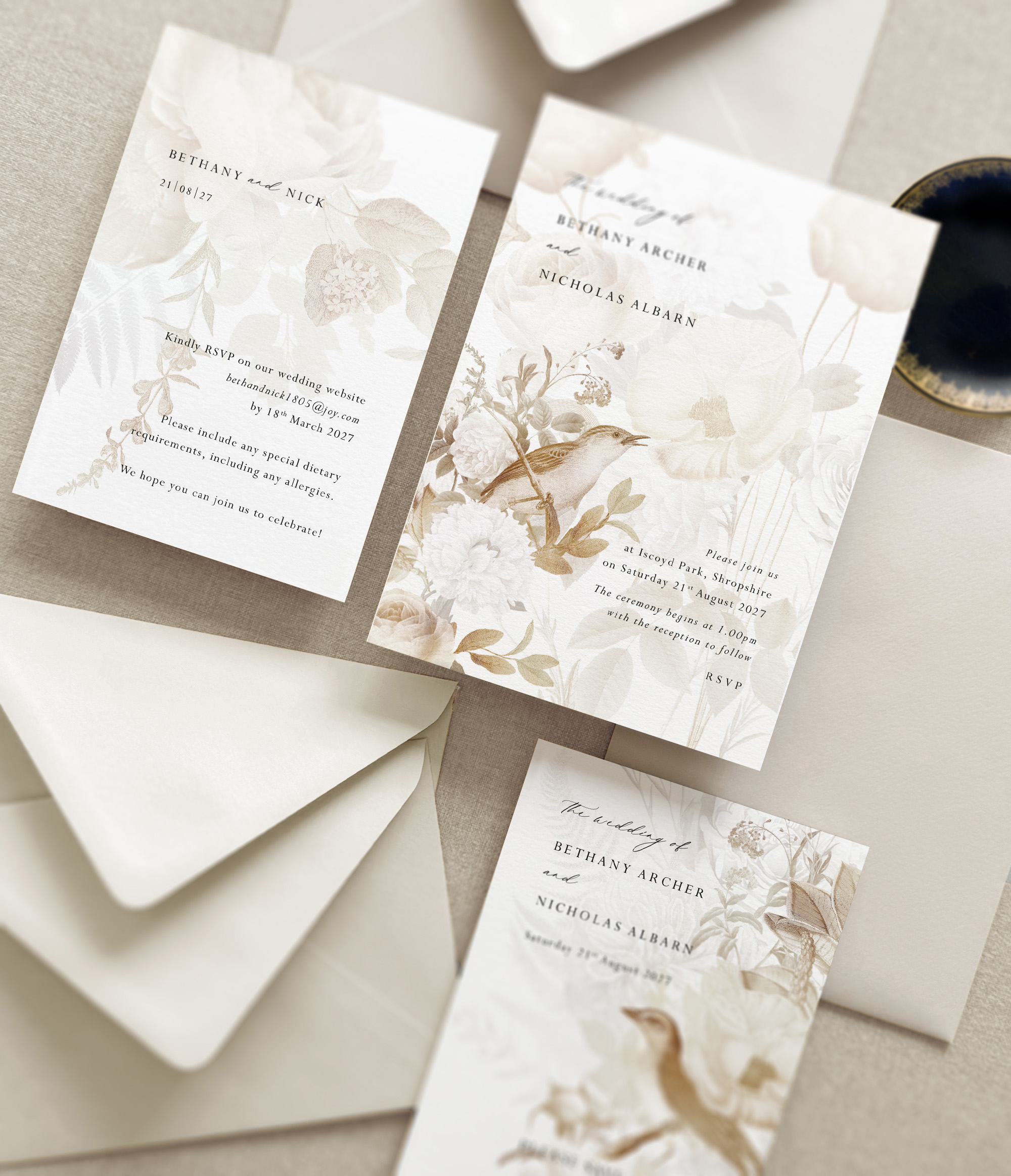 The Songbird on the day stationery will perfectly complement your exquisite reception tables. The paper pieces will accentuate your elegant and understated floral centrepieces and bring your glamorous vintage vision to life!